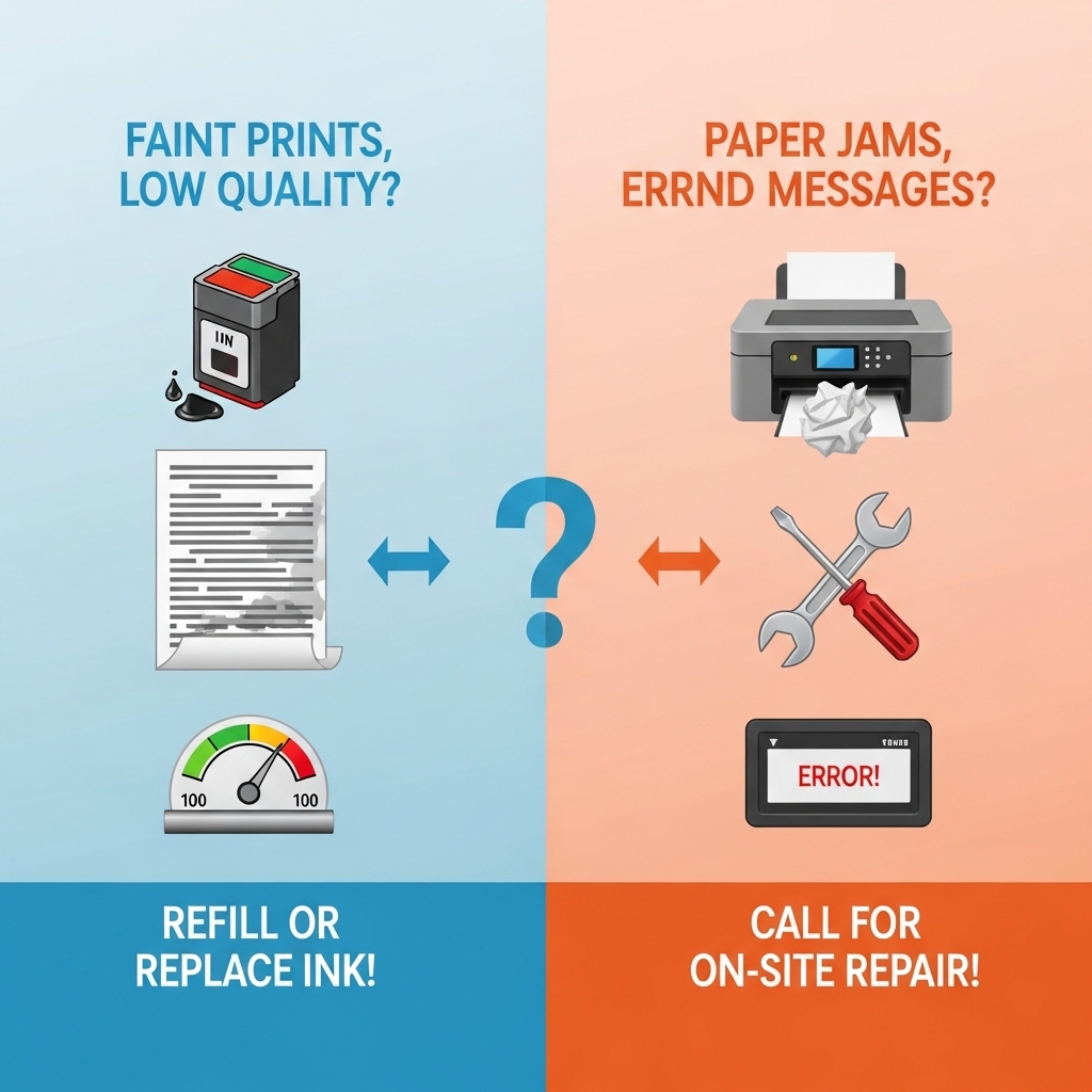 Đây không chỉ là vấn đề kỹ thuật mà còn là sự gián đoạn công việc, ảnh hưởng đến năng suất của bạn, dù bạn là hộ gia đình, nhân viên văn phòng hay chủ công ty SME. Vậy, làm thế nào để biết khi nào máy in chỉ cần nạp mực đơn giản, và khi nào thì cần đến sự can thiệp chuyên sâu của thợ sửa máy in tận nơi? Hãy cùng tôi tìm hiểu qua bài viết này!
