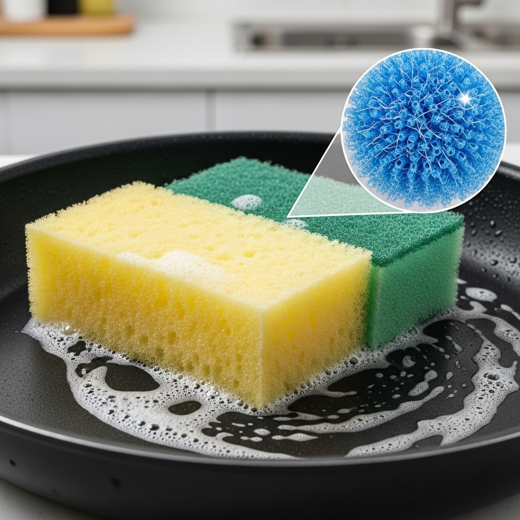 kitchen sponge, cleaning, material science, color coded, non-stick pan