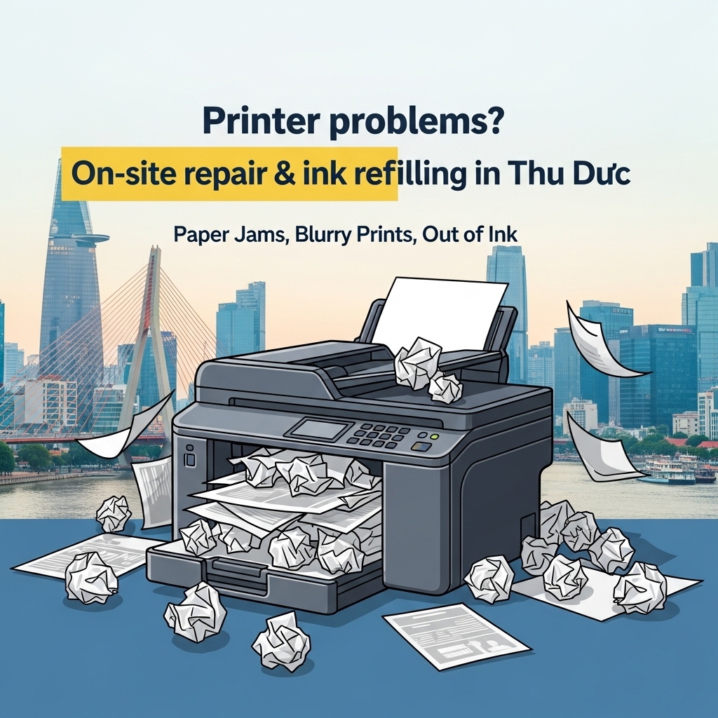 Đừng để những sự cố máy in làm gián đoạn công việc của bạn. Khi máy in của bạn gặp vấn đề, dù là sửa máy in Thủ Đức, nạp mực tận nơi Hiệp Bình Chánh, hay cần bảo trì máy in định kỳ cho văn phòng, hãy nghĩ ngay đến Vi Tính Tâm Thuận Phát.