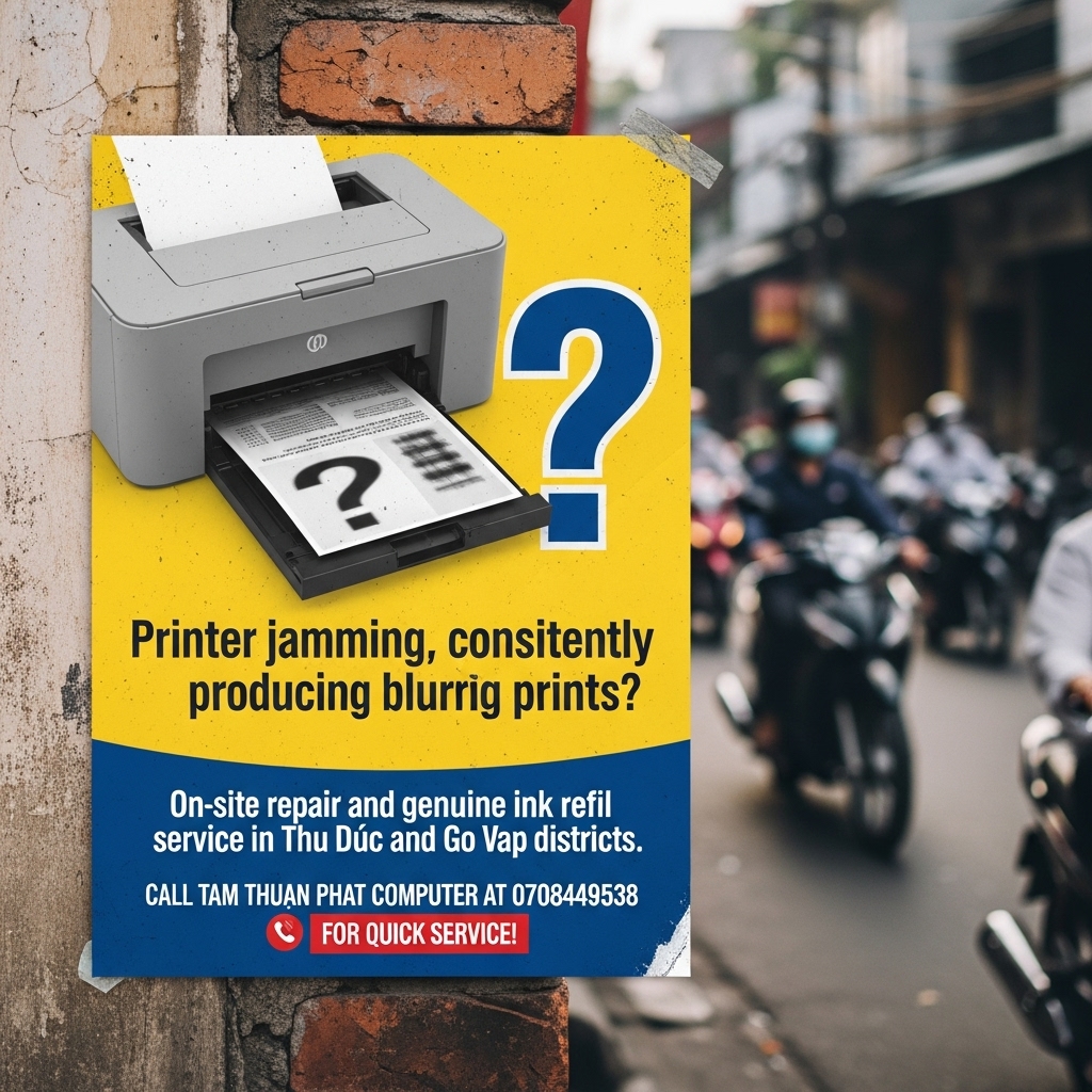 Máy in kẹt giấy, bản mờ liên tục? Khắc phục tại nhà & nạp mực chính hãng tận nơi Thủ Đức, Gò Vấp. Gọi Vi Tính Tâm Thuận Phát 0708449538 để sửa nhanh!