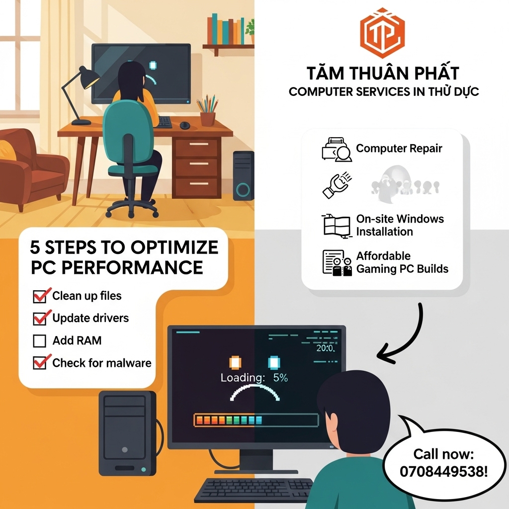 Máy tính chậm, lag? Tìm hiểu 5 bước tối ưu hiệu năng tại nhà và khi nào cần dịch vụ sửa máy tính Thủ Đức, cài Win tận nơi, build PC Gaming giá rẻ từ Vi Tính Tâm Thuận Phát. Gọi ngay 0708449538!